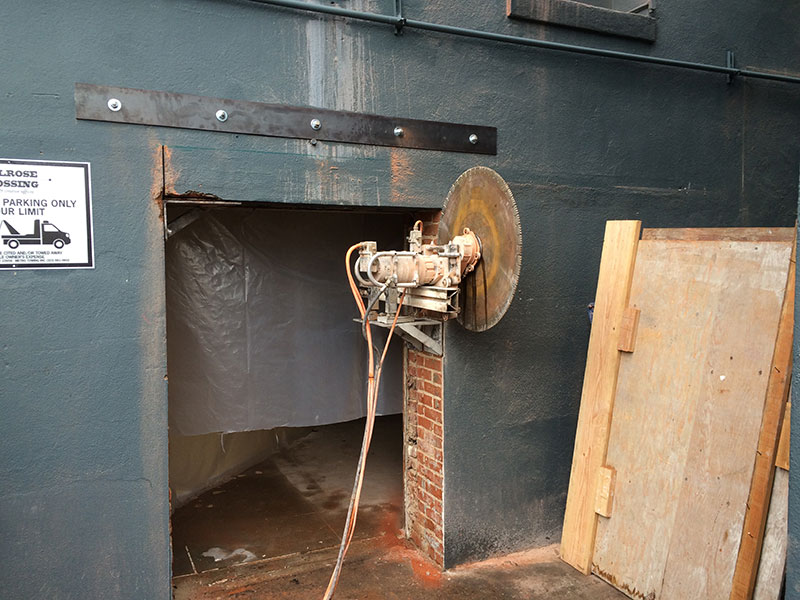 Wall sawing, or track sawing, is used on horizontal, flat or inverted surfaces. Wall saws are used to cut relief joints for demolition or complete openings for new man doors, windows, roll-up doors, mechanical openings, elevator shafts, building additions or structural footing modification; or to enlarge existing openings. Wall sawing achieves precise cuts at any angle. We regularly cut through concrete and brick from 8” to 24” thick and our 30 horsepower wall saw is capable of cutting materials up to 28” thick.